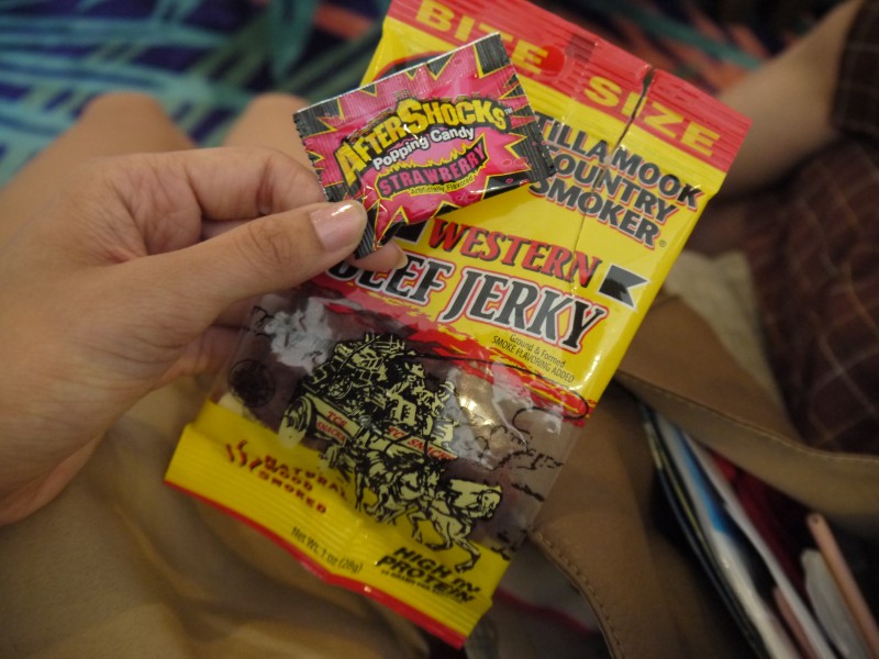 Kマートで買ったビーフジャーキー($1)と、ワタパチみたいなお菓子w