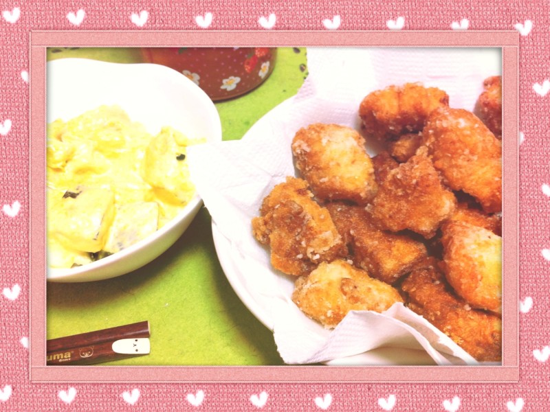 から揚げがちょっと濃い目の味付けだったので、カボチャのヨーグルトサラダをつけました。