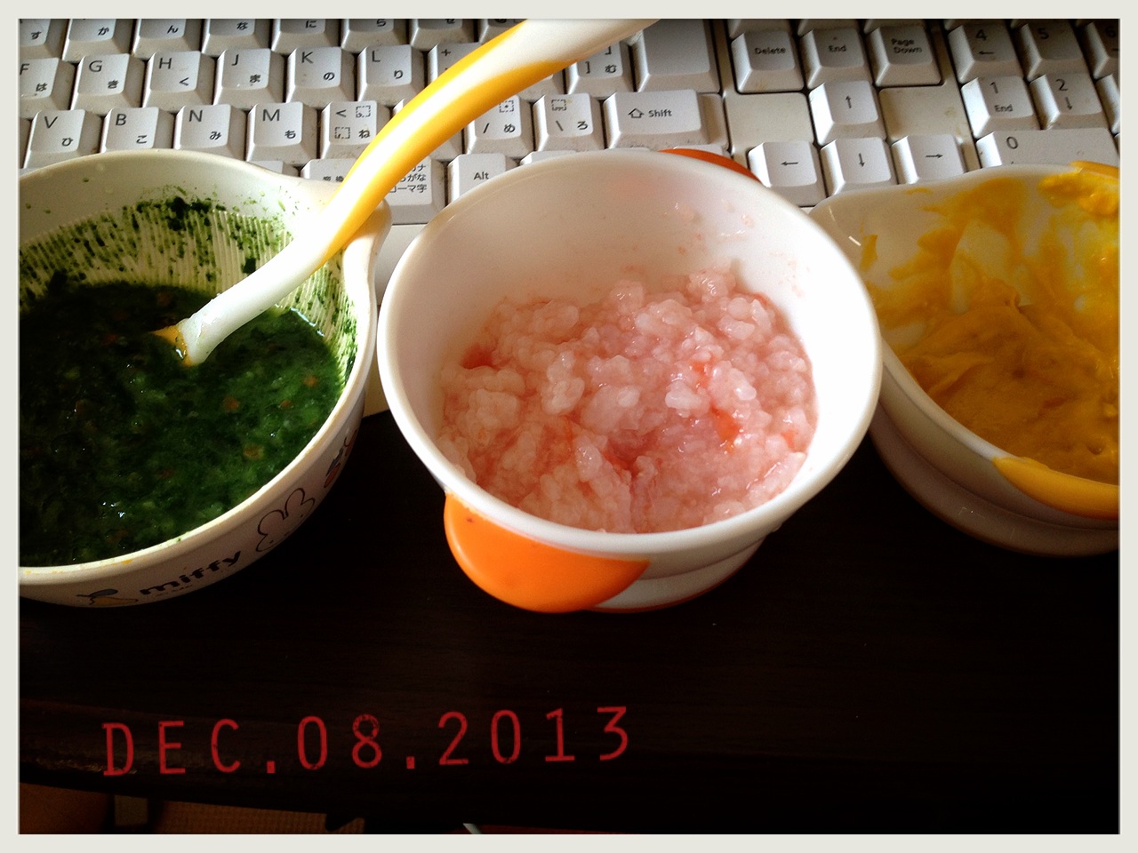 真ん中がトマト粥。おちびはトマトが好きなので、7倍粥に混ぜてあげるとよく食べます(*´ω`*)♡