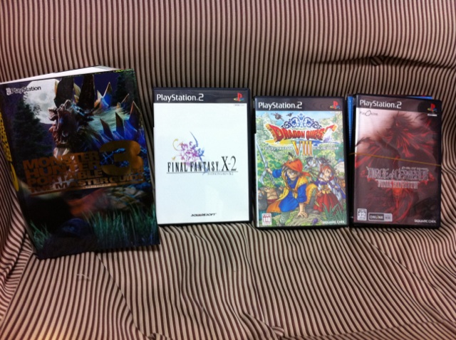 一番左のは出たばっかのMHP3の攻略本、FFX-Ⅱ、ドラクエⅧ、ダージュオブケルベロス。