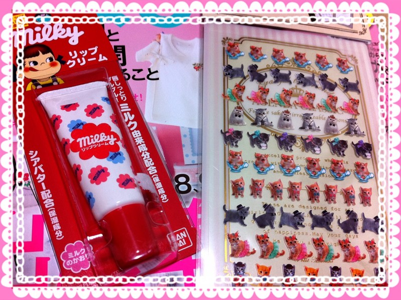 ミルキーのリップクリームと、子猫のシール。