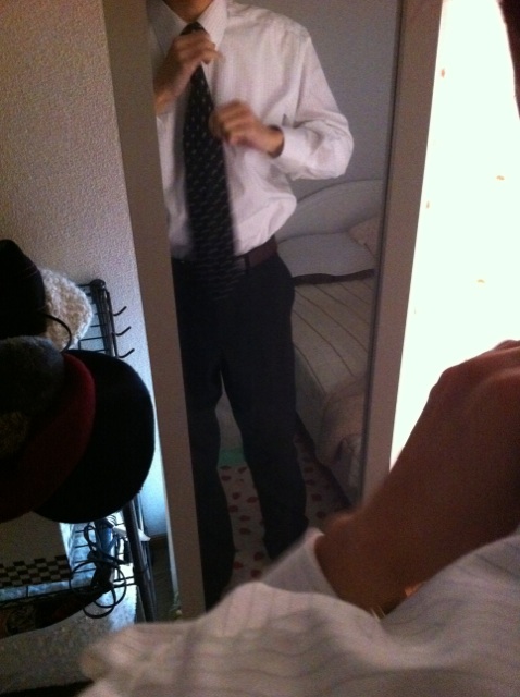 殿がネクタイ締めてるところを後ろからニヤニヤ眺めつつ写真を撮るっていう