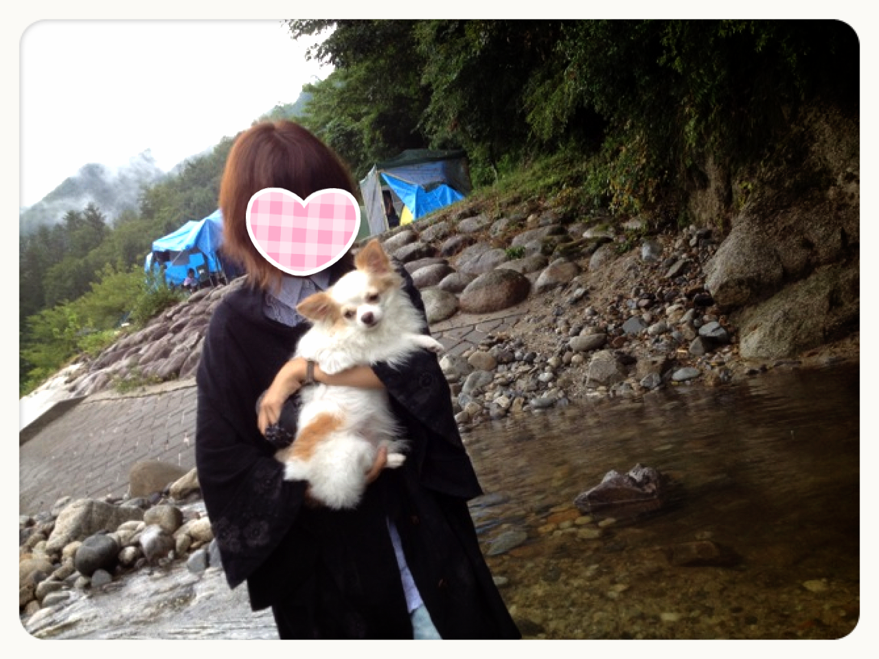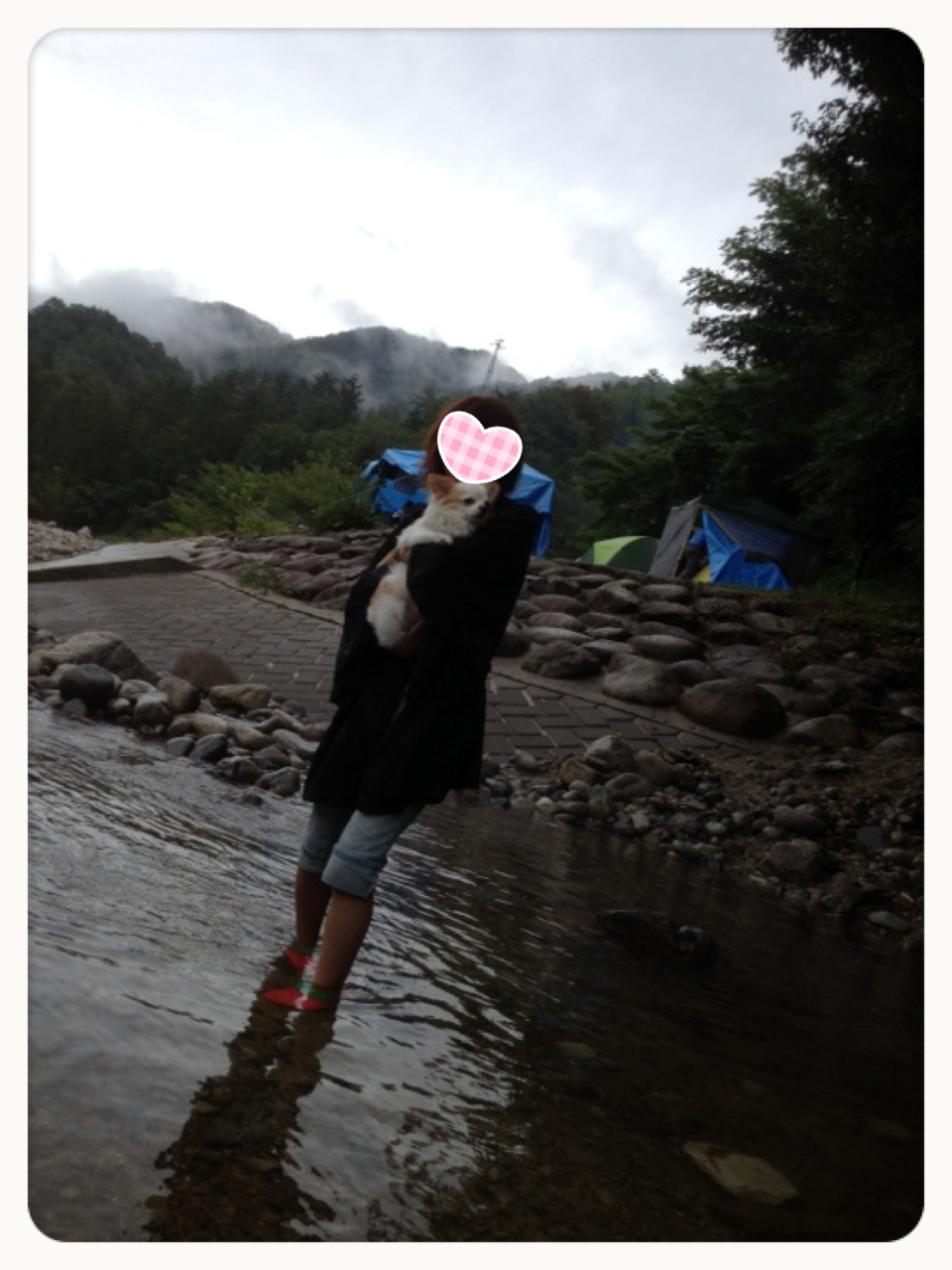 まろくん抱っこして川渡り。