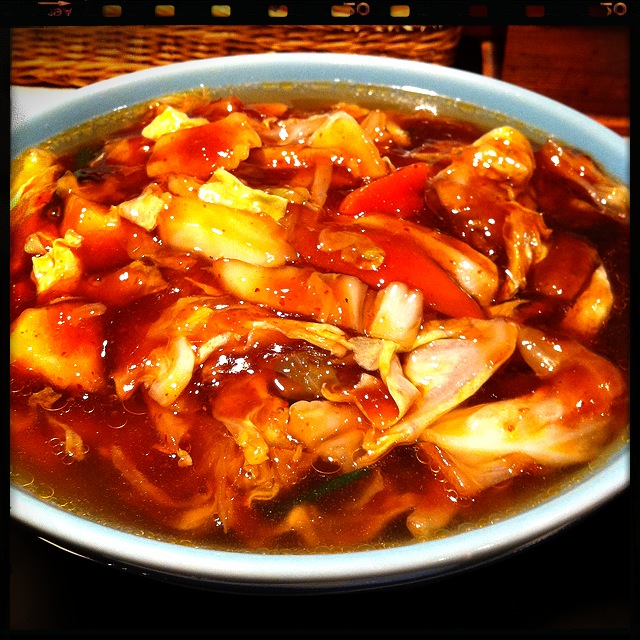 ラーメンの上に、野菜炒め+レバーのあんかけが乗ってます。