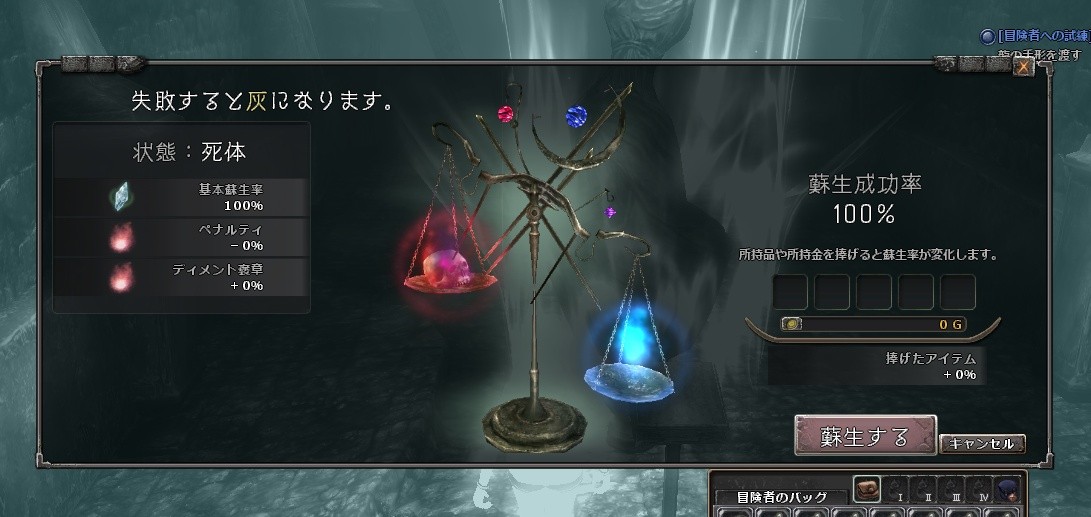 これが死のほうが重かったりすると、お金なり装備なりを天秤において、何とか死のほうを