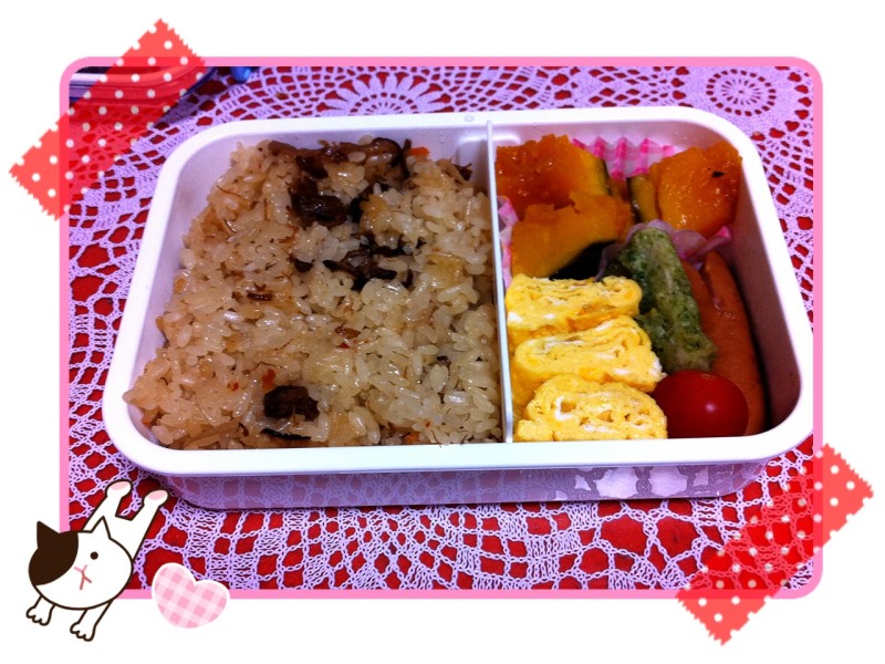 といっても本日は、昨晩のお夕食の残りの炊き込みご飯とカボチャの煮物があったので、卵とか焼いて色々詰めて、20分もかからず完成。